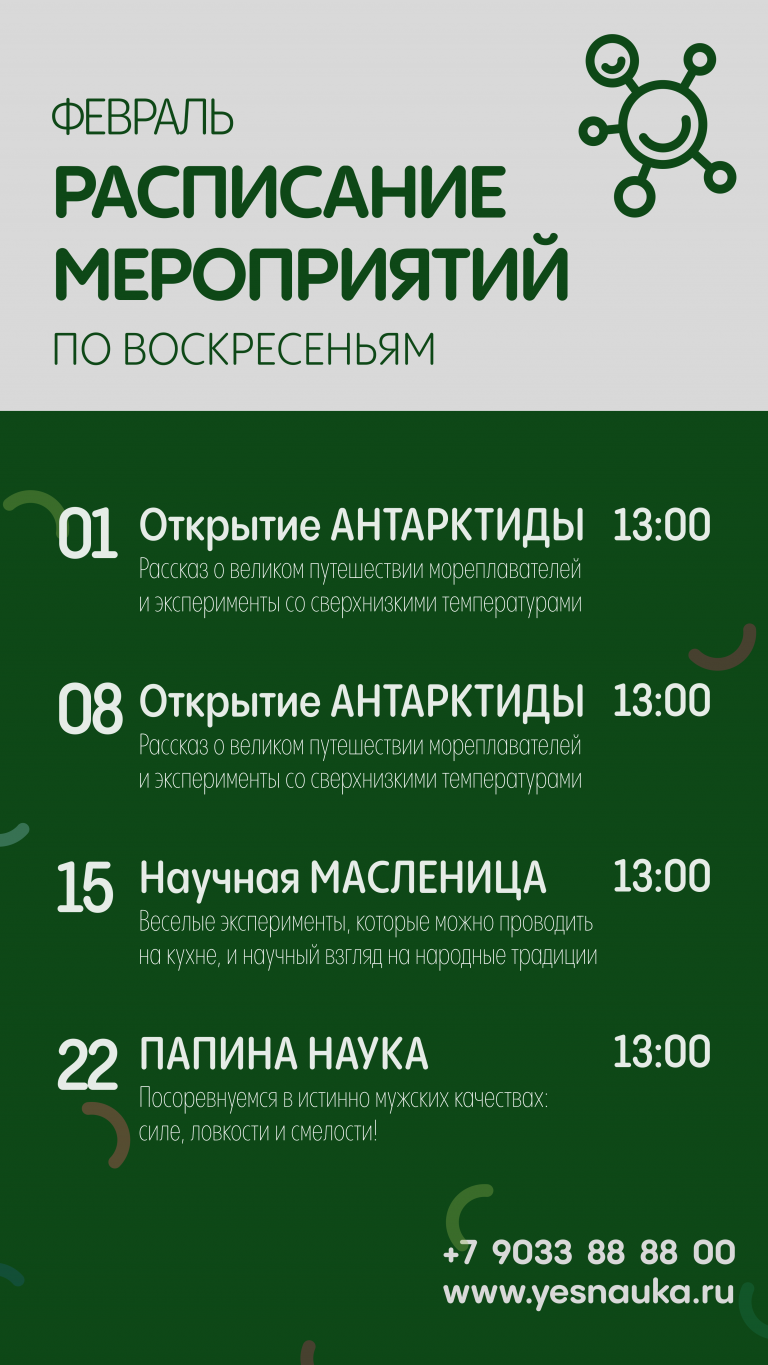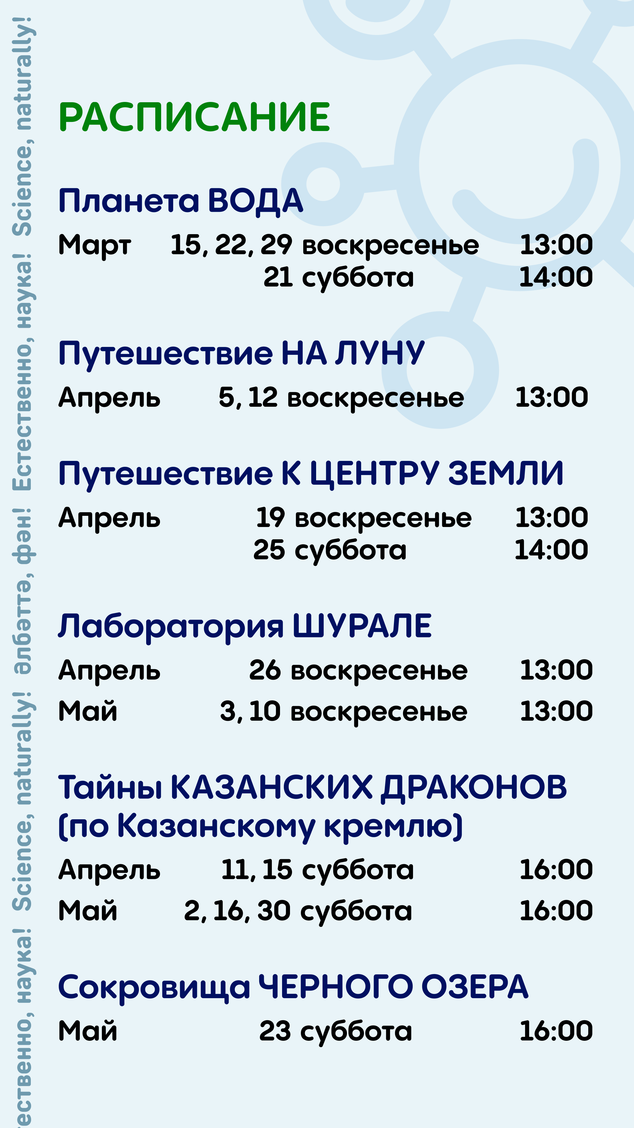 По воскресеньям в 13:00 интерактивный научный спектакль проходит в лаборатории Музея естественной истории Татарстана. Темы меняются по расписанию.